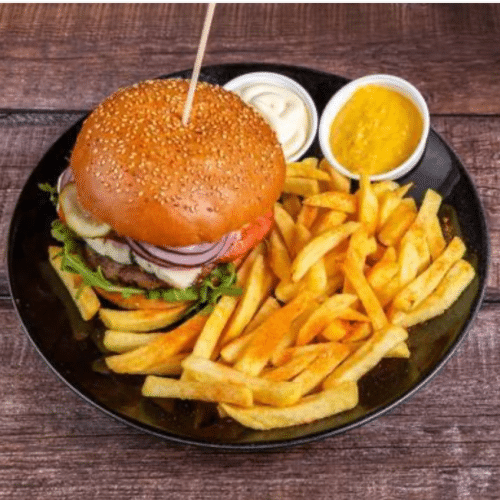 1 Hamburger mit 90g Rindfleisch-Patty,mit salat, Tomaten, Mayonnaise,Ketchup, Eck sauce, Pommes frites, Capri Sun 0,2l, kleine Überraschung.